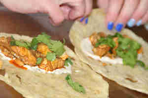 מורחים על מופלטה טחינה במרכז שמים מעורב דגים מגלגלים ניתן לחתוך לחצאים או להגיש שלם בליווי של טחינה .